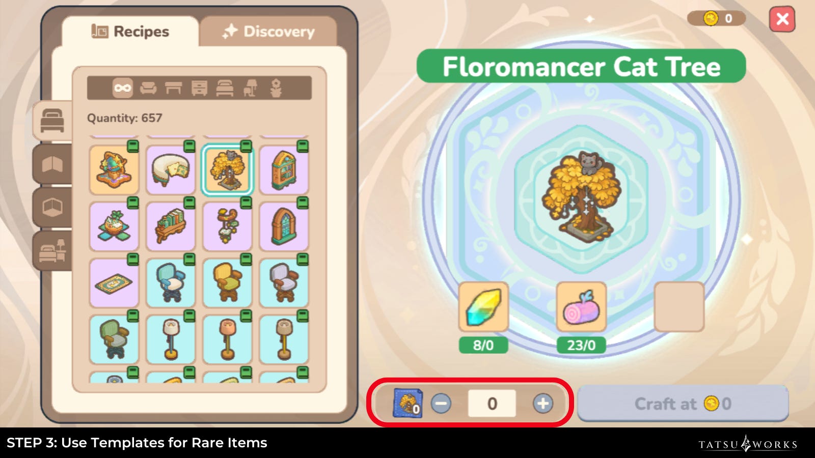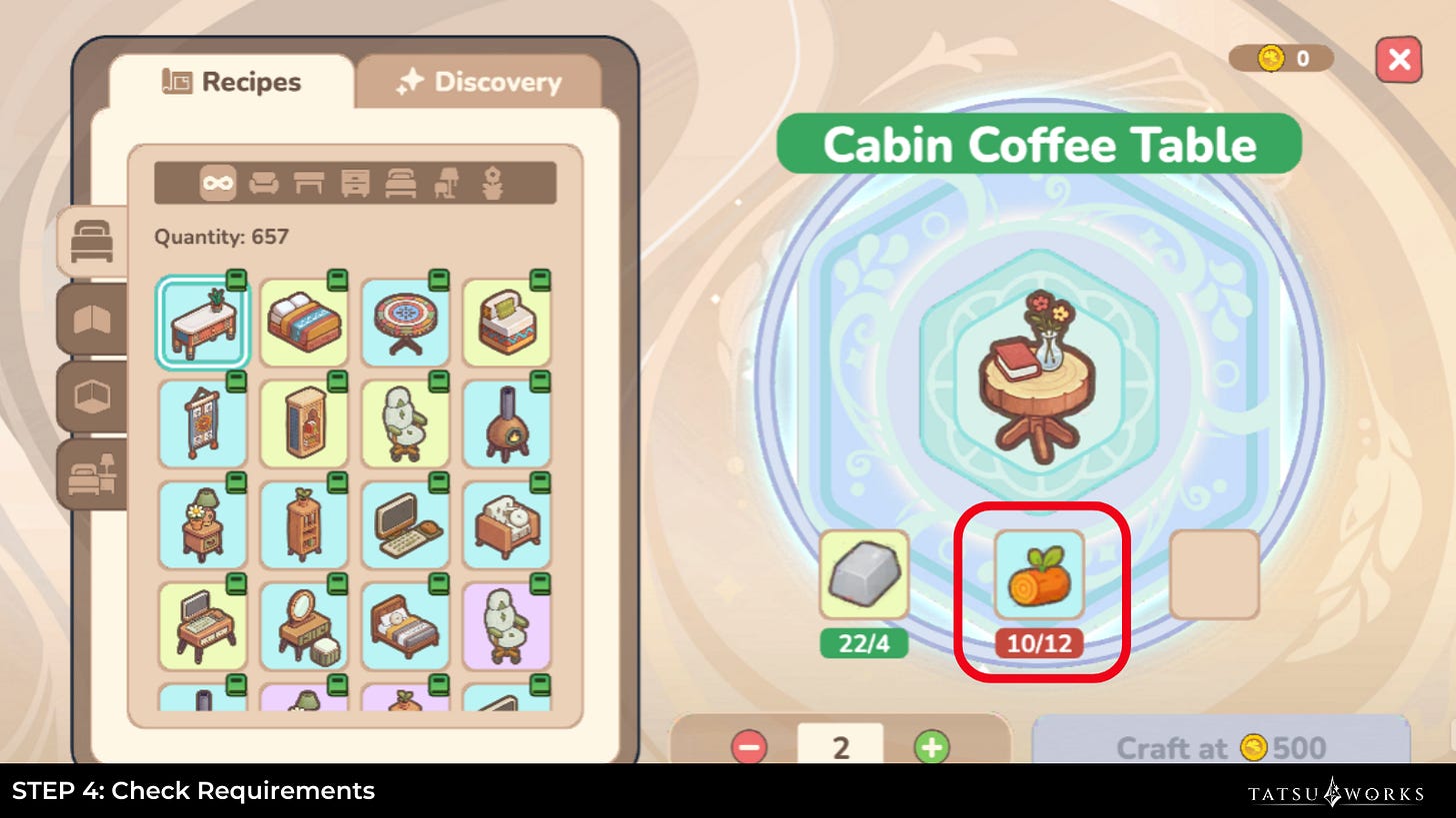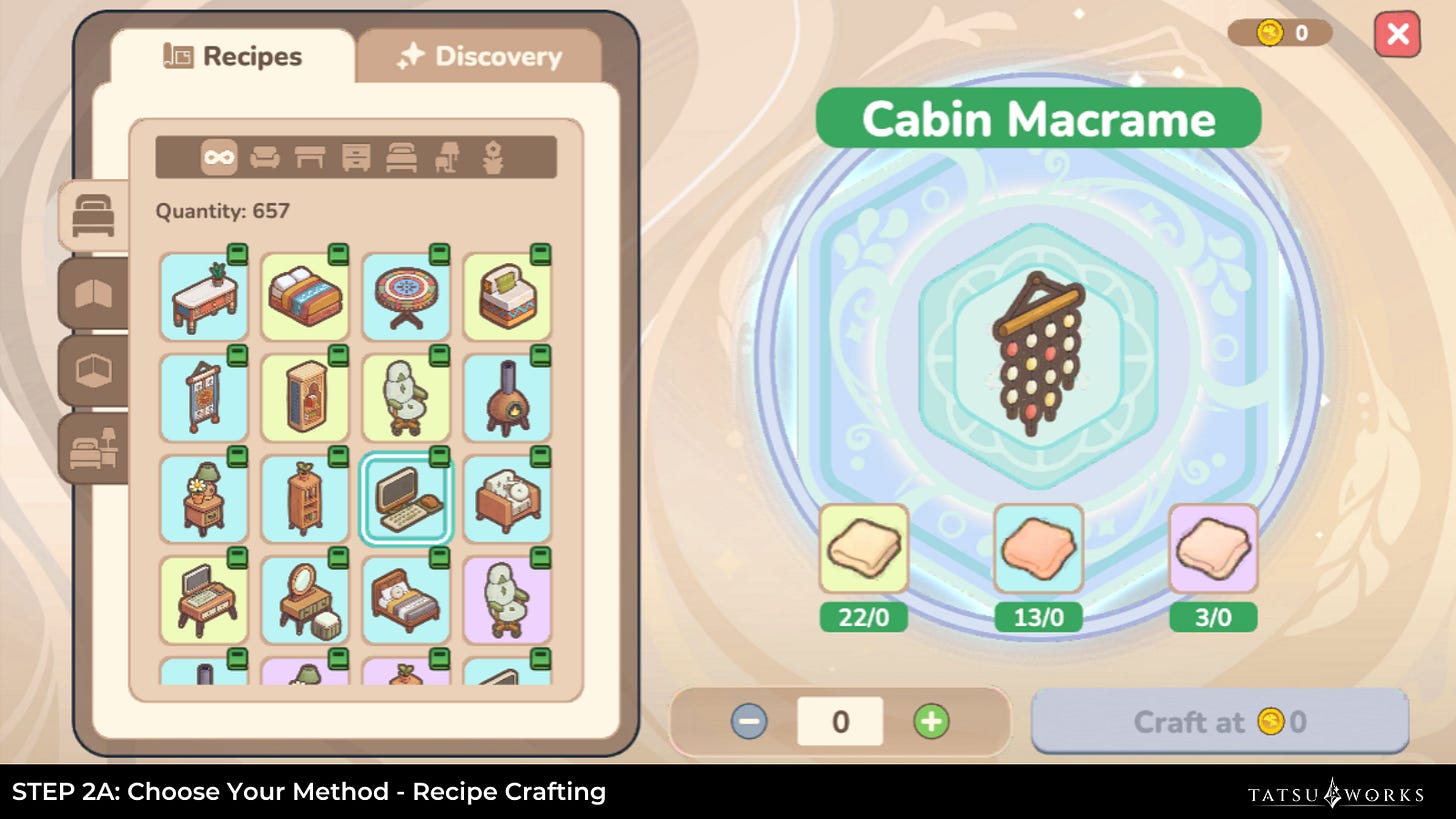 With Recipe Crafting, youâll see exactly which materials are required for a piece of furniture and can craft it directly. In Discovery, you can slot up to 3 materials to experiment. A successful attempt unlocks the recipe permanently.