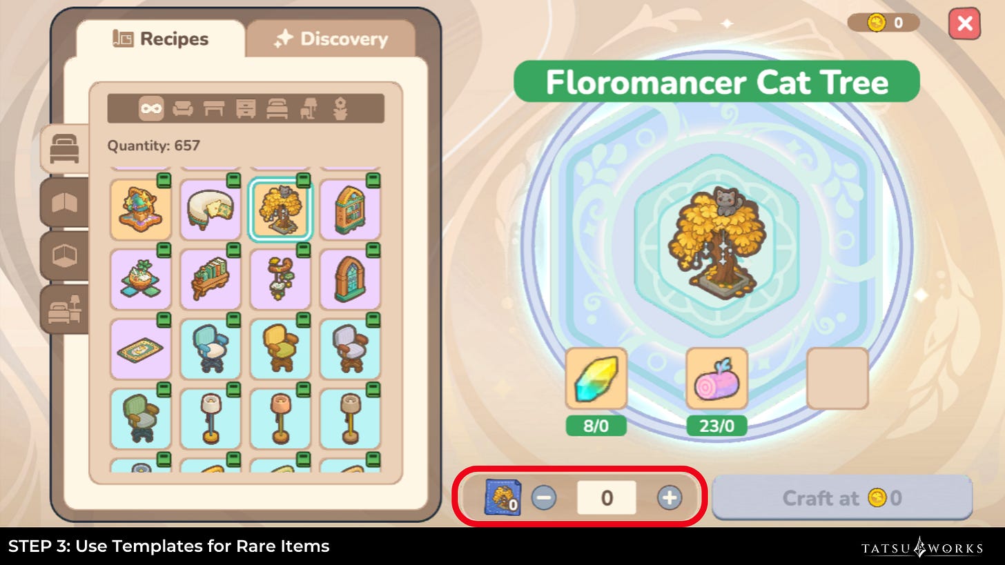 Templates: These are special items used to craft certain higher-rarity furniture. Each Template is consumed when you craft, so use them wisely!