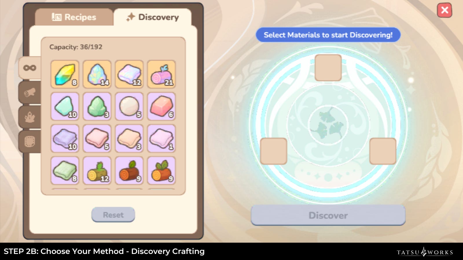 Discovery: Place up to 3 materials and see what happens. If the combination is right, youâll uncover a hidden recipe and keep it for good. A little trial, a little error, and a lot of surprise.
