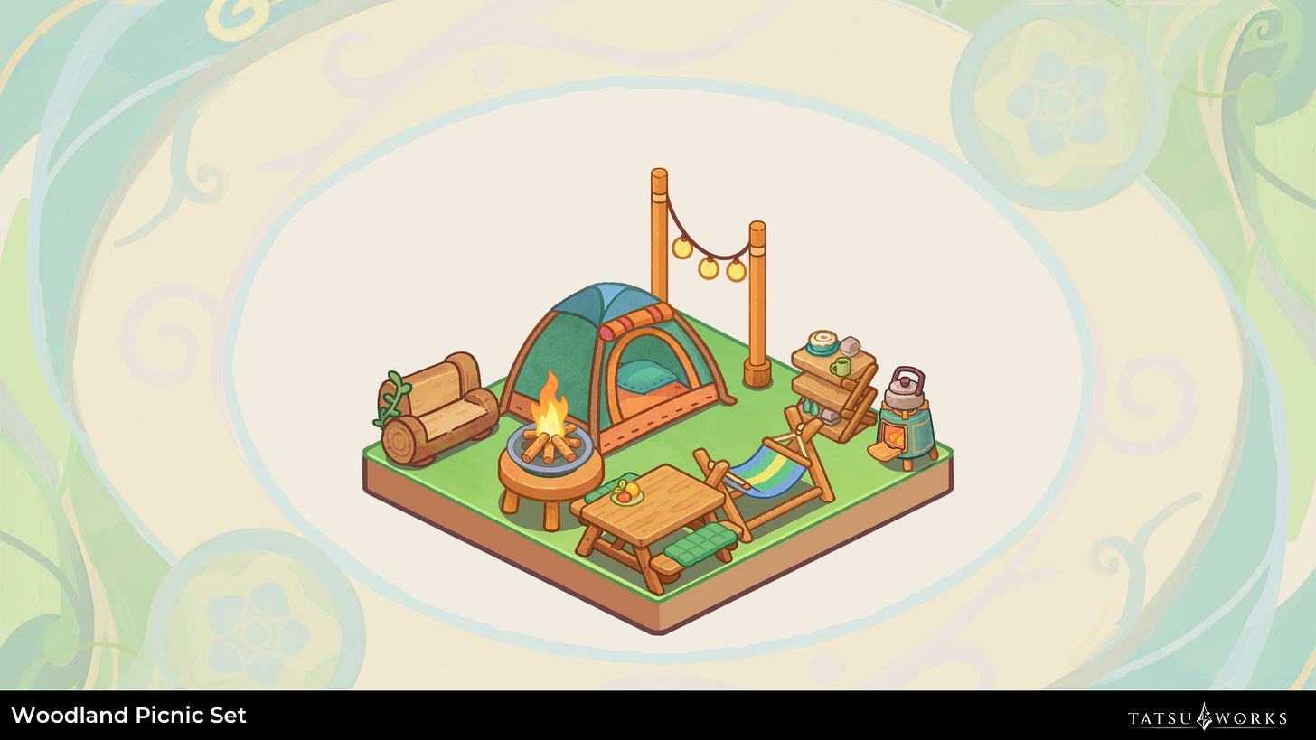 With a total of 10 unique furnishings to craft with, you can pitch a tent, arrange your camping essentials, and create a space built for pure relaxation. Whether you are stargazing by the fire or soaking in the calm of the night, transform your outdoor space into a cozy forest campsite you will look forward to every time you log in.
