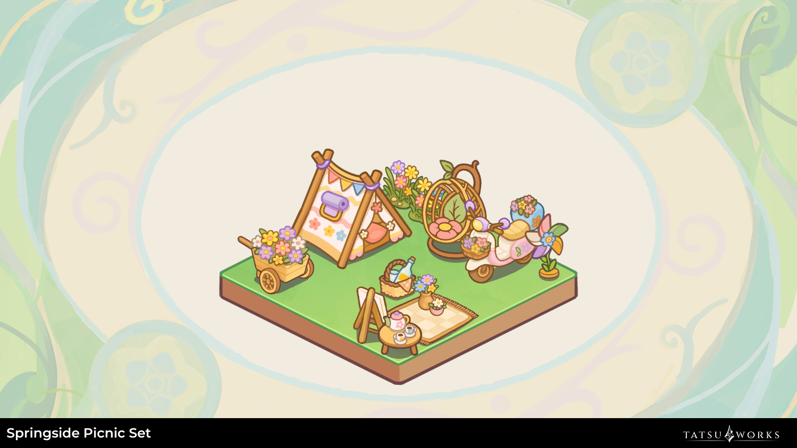 Secondly, stop by the flowery fields of Florise and relax with the Springside Picnic set. A spring-themed picnic set featuring the best of Floriseâs outdoors, pastel colors, and flowers! From enjoying a tea party or sketching the great outdoors, every piece in this collection is painted in spring tones of pink, lavender, and fresh green, carrying the bloom of Florise right into your yard.