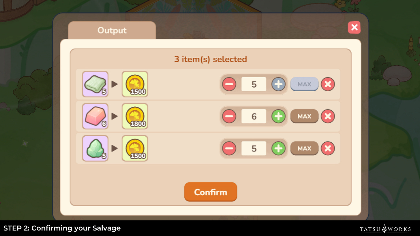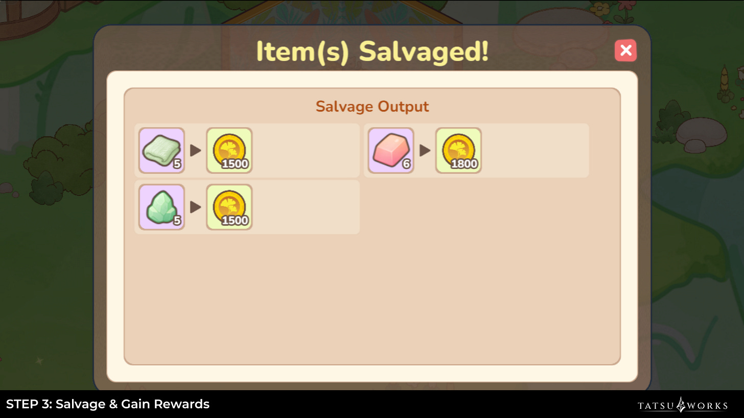 Once confirmed, all items will be salvaged and you will find a summary of all the items you have salvaged, as well as the associated items that you earn!